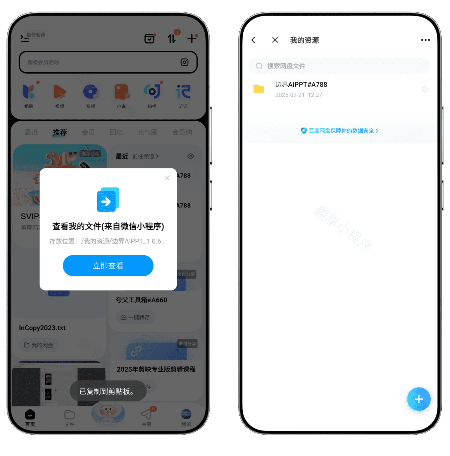 打开你的手机端百度网盘后会自动识别刚刚保存的文件,点击“